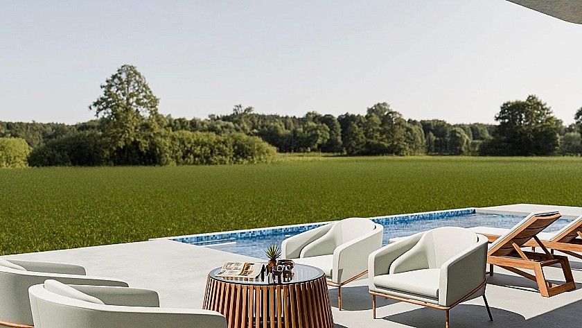 Hinweis: Im dargestellten Modell sind Gästehaus, Sommerküche und zusätzliche Betonterrasse optional und nicht im Basispreis enthalten.