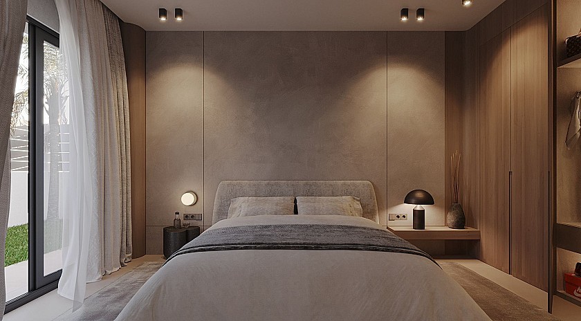 White lacquered interior doors with steel or black handles. Built-in wardrobes up to the ceiling in the main bedroom, combining elegance and functionality.