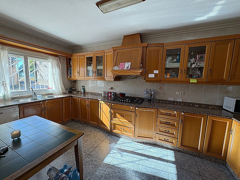 The house features six generous bedrooms and three modern bathrooms, providing ample space for family living or guest accommodation. The bright and welcoming lounge-dining area flows seamlessly into a fully equipped kitchen, complemented by a separate dining room that opens onto a covered terrace — ideal for al fresco dining or relaxing while enjoying views of the large patio with private swimming pool and multiple seating areas.