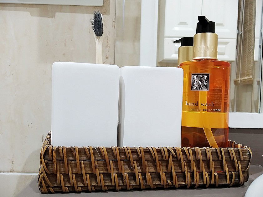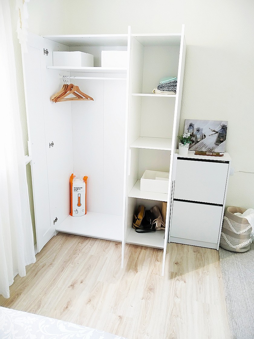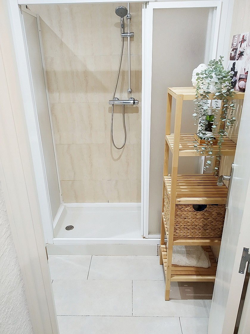 Baño: un baño completo equipado con plato de ducha y mampara, lavabo con mueble bajo, mueble auxiliar, estantería de madera y productos de baño incluidos.