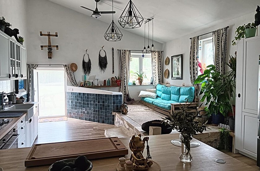 El despacho da acceso a la antigua bodega, que se ha transformado en un amplio salón-comedor-cocina de planta abierta (aprox. 70 m²).