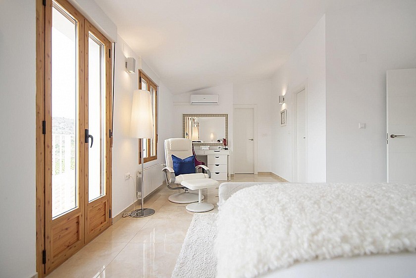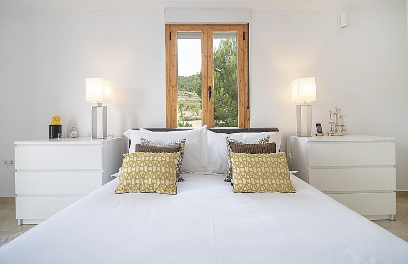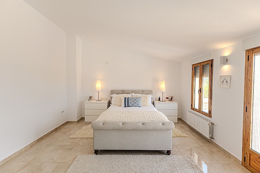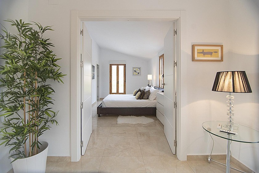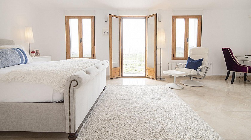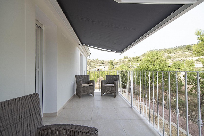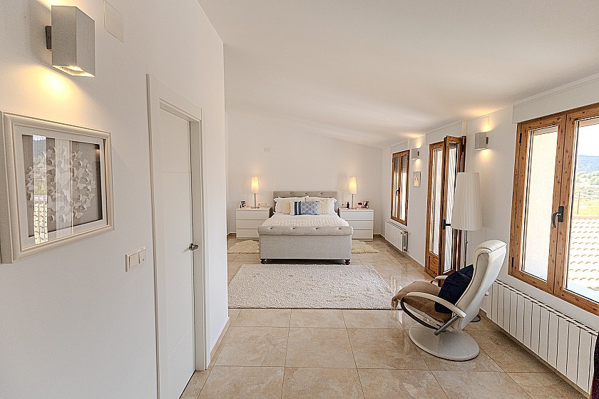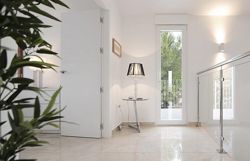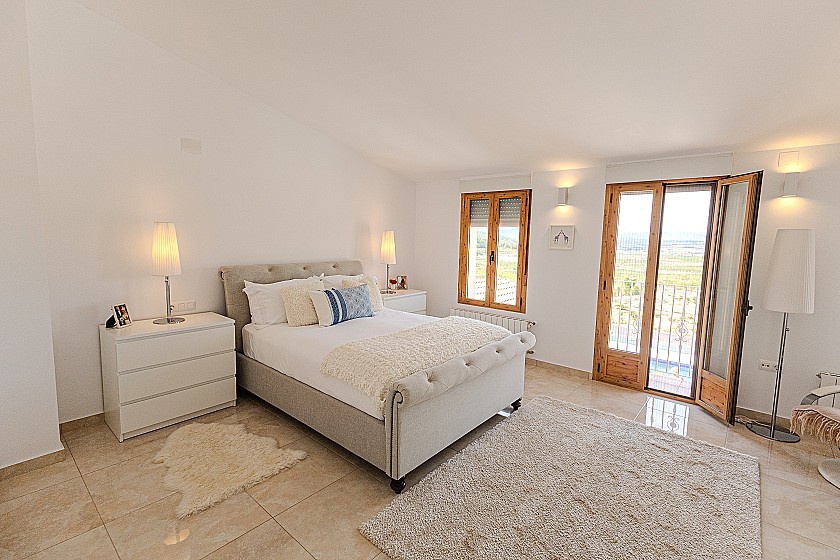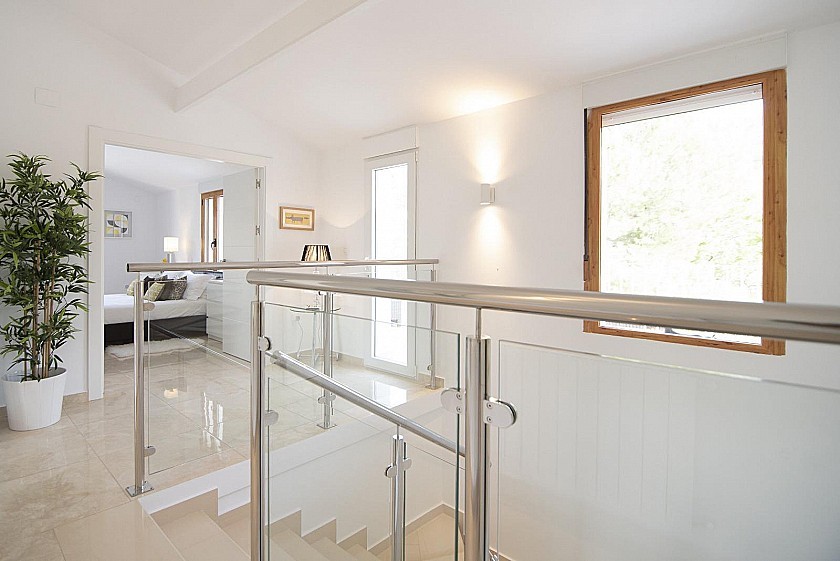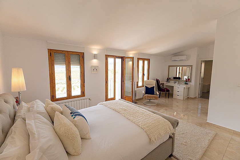 Una impresionante escalera ancha de azulejos, completa con barandillas de cromo y vidrio, conduce al primer piso donde hay un magnífico dormitorio principal con vestidor y baño que incluye dos lavabos, bidet, inodoro, bañera y un gran vestidor con paredes de vidrio. ducha. En esta planta se encuentran un total de 3 habitaciones dobles, todas con balcones estilo Julieta, vestidores y su propio baño. Todas las habitaciones tienen fantásticas vistas al campo circundante. Una puerta que sale del gran rellano con paneles de vidrio conduce a una terraza de ancho completo con vistas al parque natural. Se pueden desplegar toldos eléctricos dobles siempre que se requiera sombra adicional.