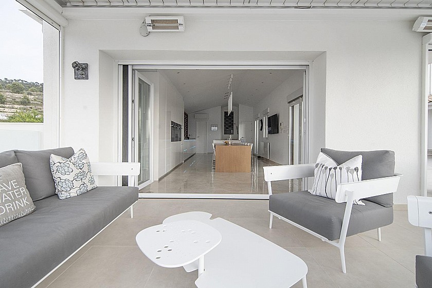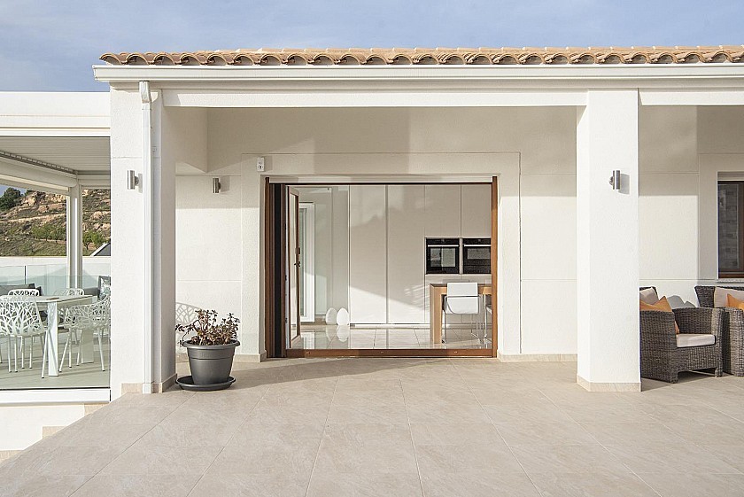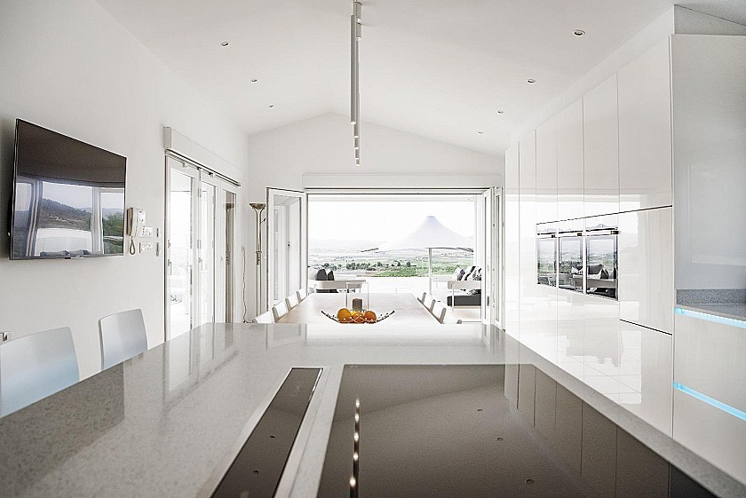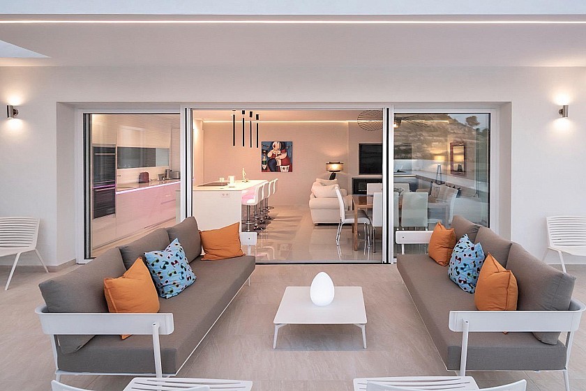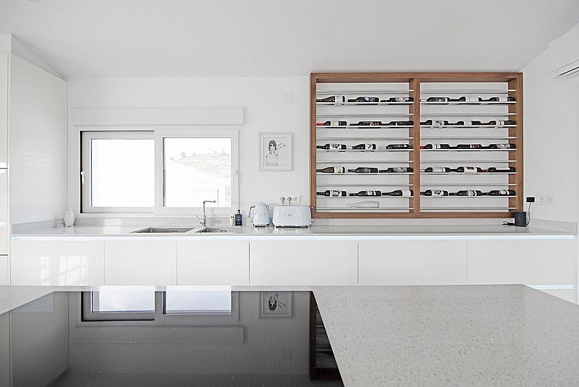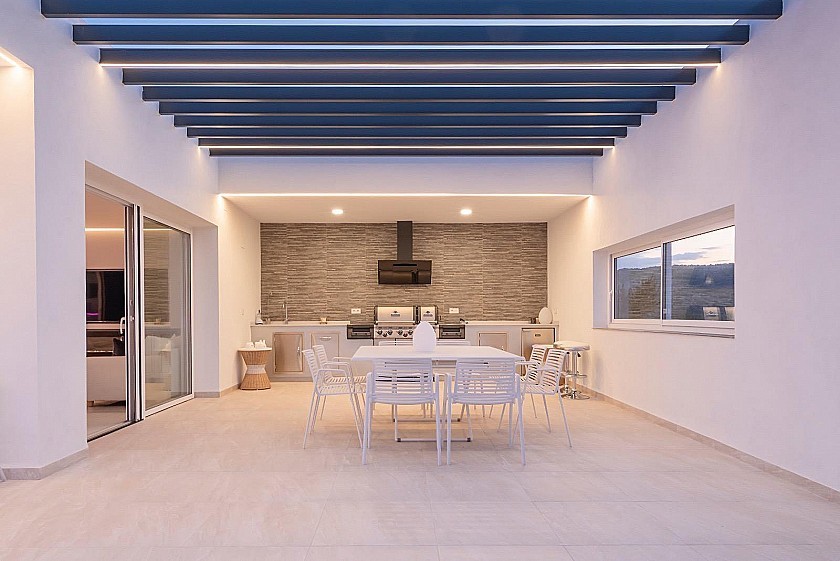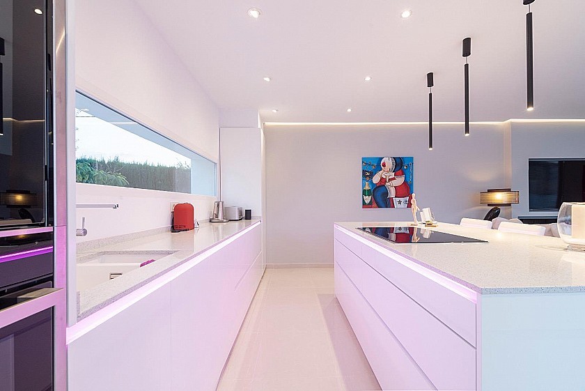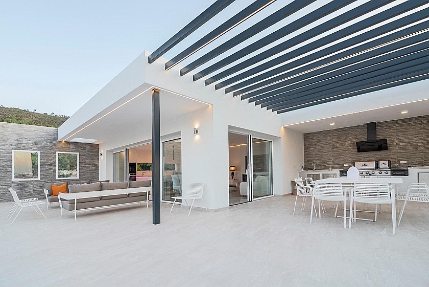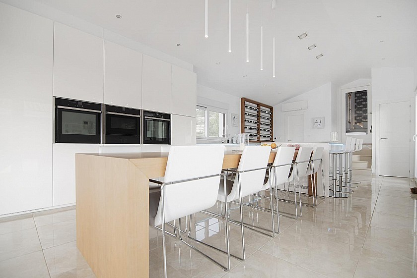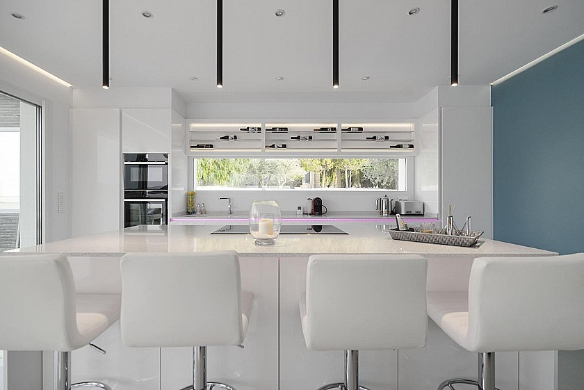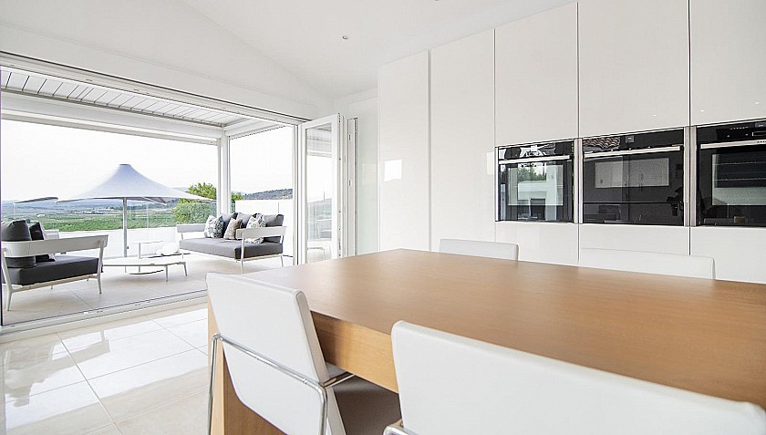 La villa cuenta con una cocina y un comedor de última generación. Los electrodomésticos integrados de alta calidad incluyen hornos Neff dobles y microondas. La gran isla incluye una placa de inducción de alta gama completa con un extractor integrado que se eleva desde la isla con el toque de un botón. Una gran cantidad de espacio de almacenamiento con armarios y cajones empotrados cubre un lado de la cocina e incluye un lavavajillas Miele. Dos refrigeradores Liebherr integrales de altura completa completan las características integradas de esta hermosa cocina. En un extremo de la cocina hay una gran despensa y un vestidor más pequeño de altura completa. En el extremo opuesto, las puertas plegables de vidrio se abren a una terraza cubierta especialmente diseñada, perfecta para cenar al aire libre. La terraza está cubierta con un techo metálico eléctrico que se puede abrir pulsando un botón. Cuando se requiere sombra adicional, los cuatro lados tienen persianas eléctricas que se pueden controlar de forma independiente mediante un mando a distancia que también controla la luz y la calefacción de la terraza. Las vistas desde la cocina son maravillosas y los atardeceres indescriptibles. Todas las ventanas de la cocina, incluidos los dos juegos de puertas plegables, tienen persianas eléctricas.