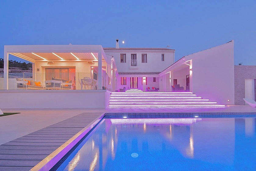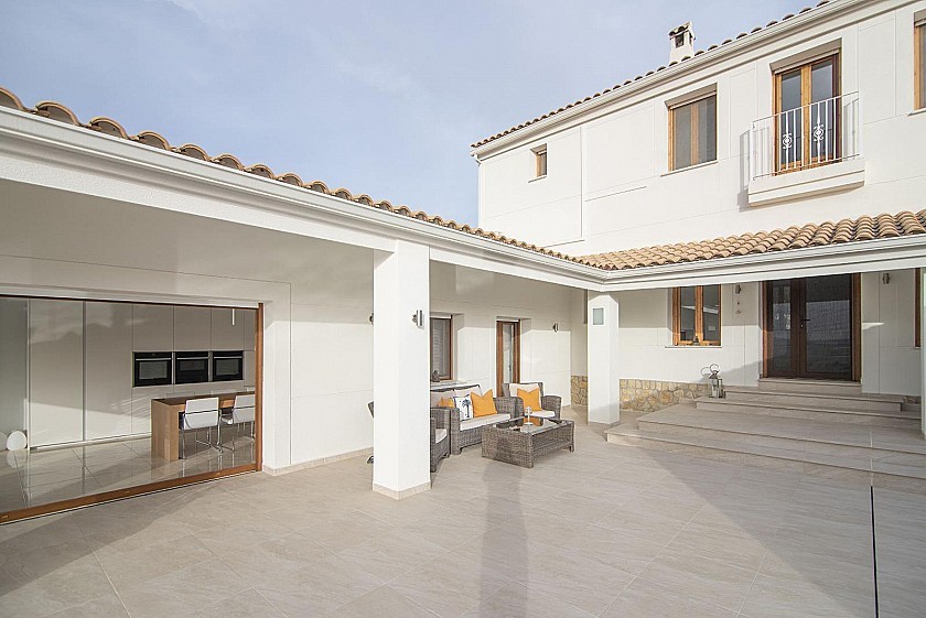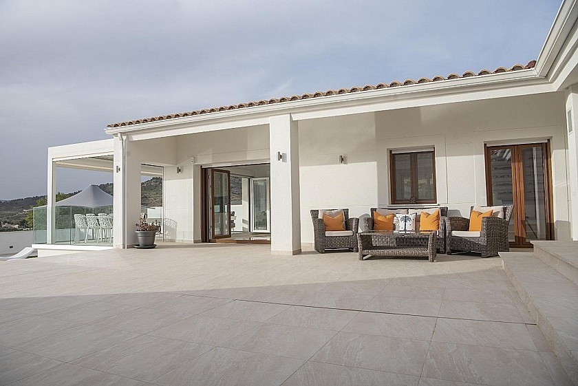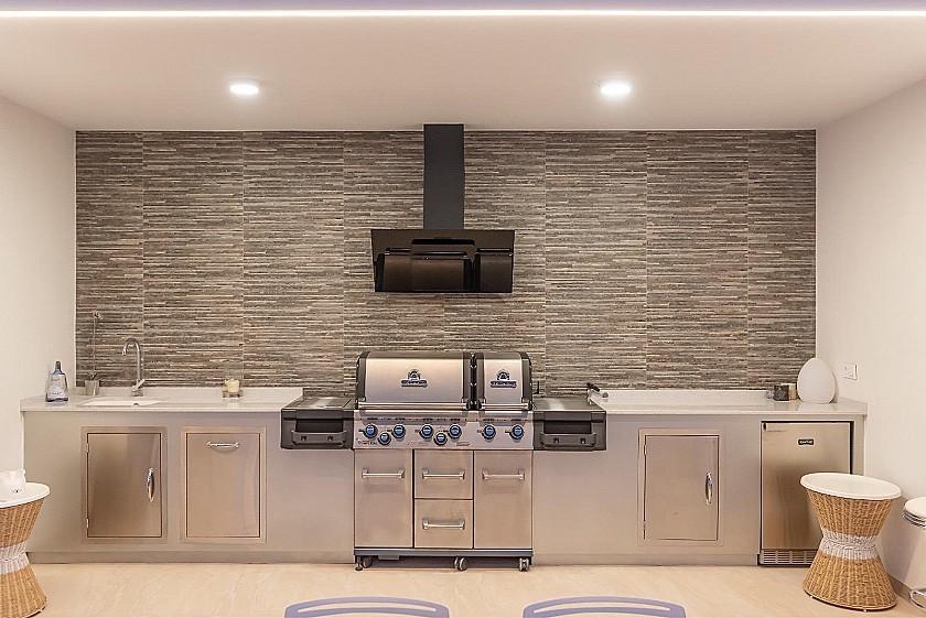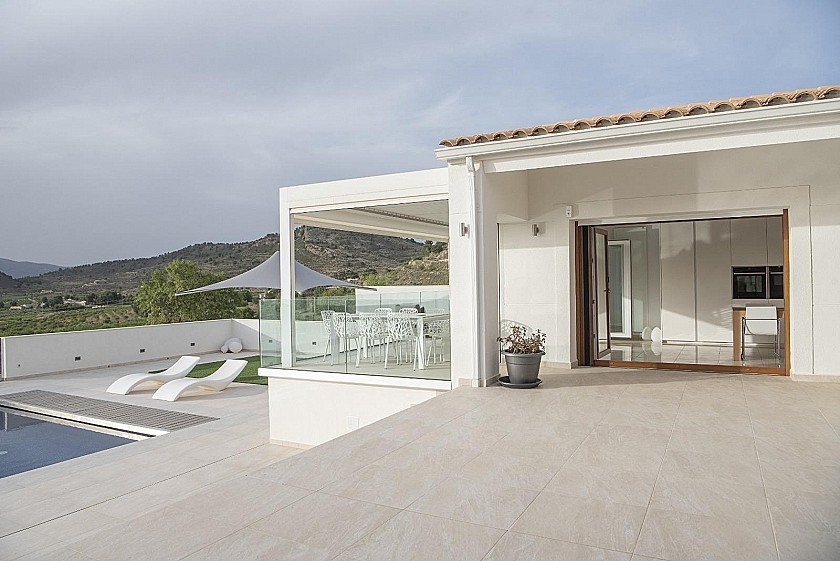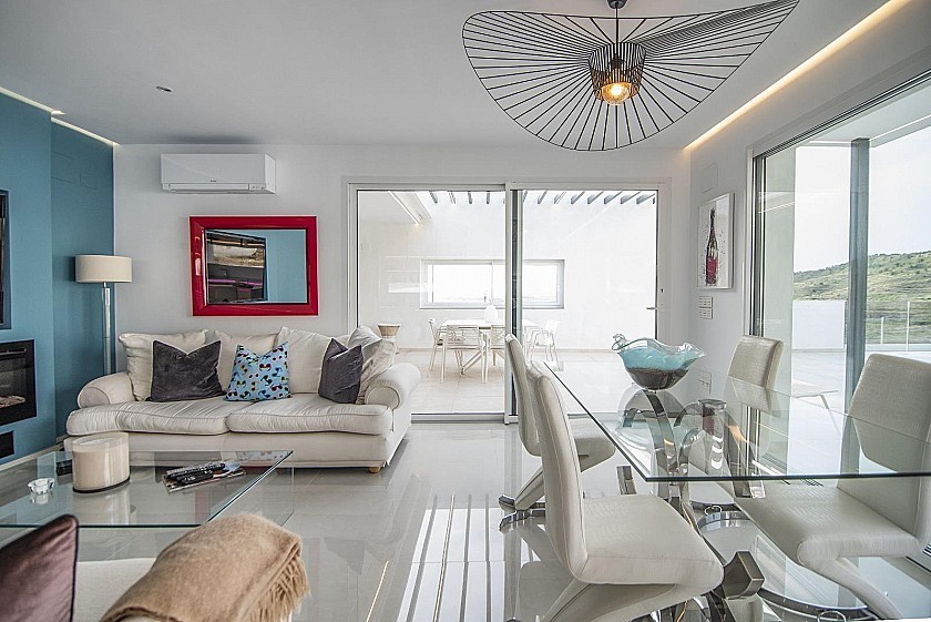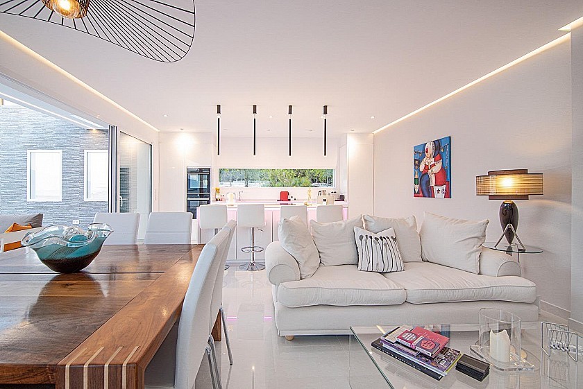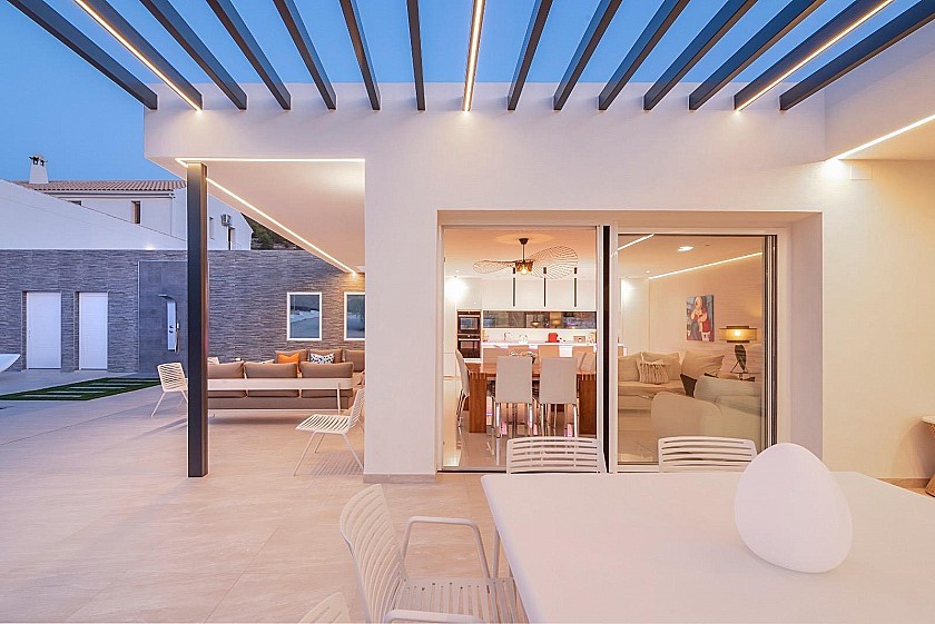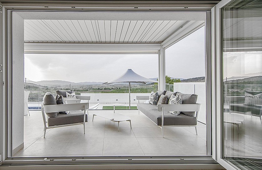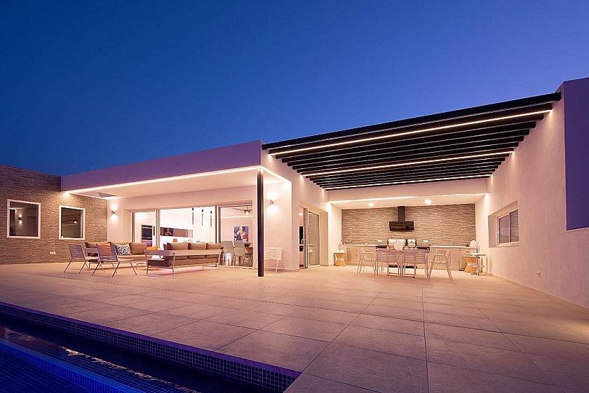 La villa cuenta con una cocina y un comedor de última generación. Los electrodomésticos integrados de alta calidad incluyen hornos Neff dobles y microondas. La gran isla incluye una placa de inducción de alta gama completa con un extractor integrado que se eleva desde la isla con el toque de un botón. Una gran cantidad de espacio de almacenamiento con armarios y cajones empotrados cubre un lado de la cocina e incluye un lavavajillas Miele. Dos refrigeradores Liebherr integrales de altura completa completan las características integradas de esta hermosa cocina. En un extremo de la cocina hay una gran despensa y un vestidor más pequeño de altura completa. En el extremo opuesto, las puertas plegables de vidrio se abren a una terraza cubierta especialmente diseñada, perfecta para cenar al aire libre. La terraza está cubierta con un techo metálico eléctrico que se puede abrir pulsando un botón. Cuando se requiere sombra adicional, los cuatro lados tienen persianas eléctricas que se pueden controlar de forma independiente mediante un mando a distancia que también controla la luz y la calefacción de la terraza. Las vistas desde la cocina son maravillosas y los atardeceres indescriptibles. Todas las ventanas de la cocina, incluidos los dos juegos de puertas plegables, tienen persianas eléctricas.