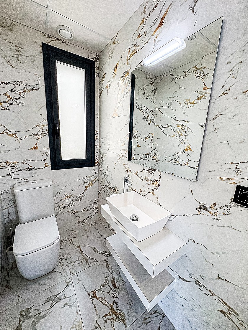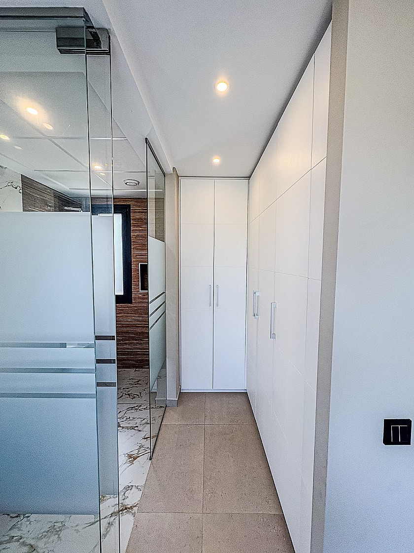 Het dakterras beschikt over een pergola die schaduw biedt tijdens warme dagen. Vanaf hier geniet u van panoramisch uitzicht over de kust en de omliggende bergen. De villa heeft een privé verwarmd zwembad (7x3 m) met kleurrijke verlichting en elektrische afdekking – groter dan de standaard 6x3 m, voor extra luxe en ontspanning.