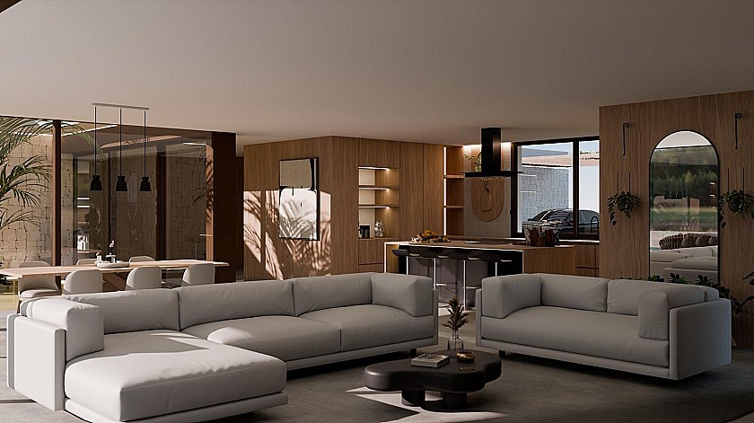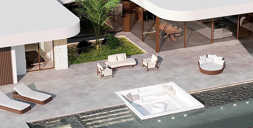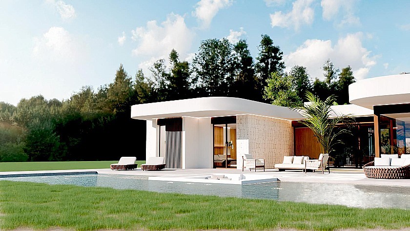Opmerking: In het getoonde model zijn het gastenverblijf, de zomerkeuken en het extra betonnen terras optioneel en niet inbegrepen in de basisprijs.