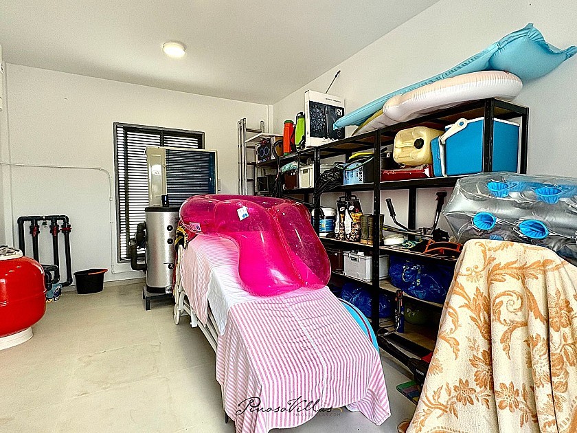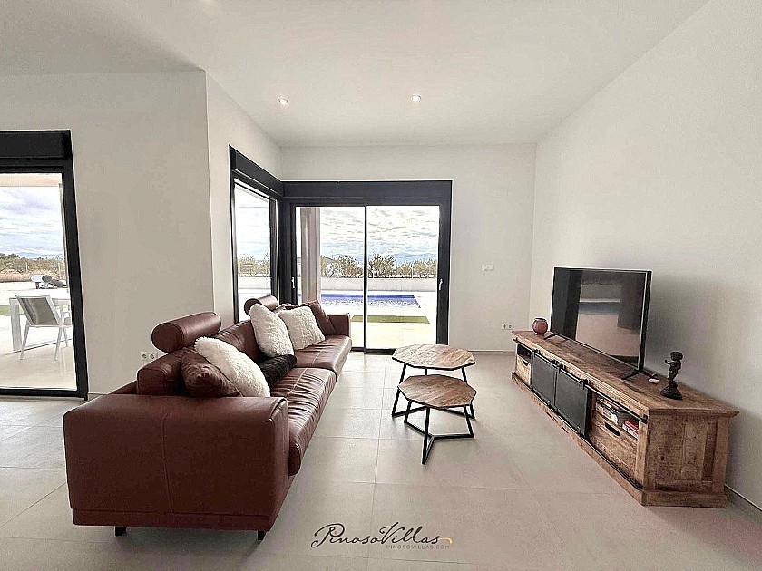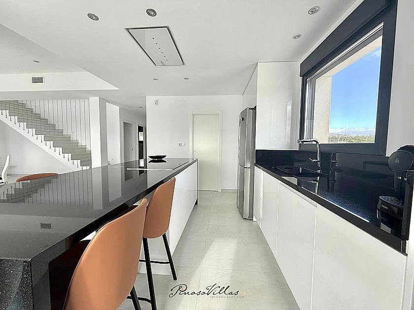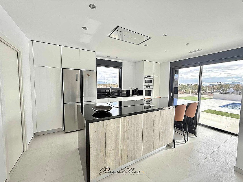 De moderne keuken is voorzien van een kookeiland, perfect voor entertainment, en een grote bijkeuken voor extra gemak. De lichte en ruime woonkamer kijkt uit op het zwembad en biedt een adembenemend uitzicht op de bergen.